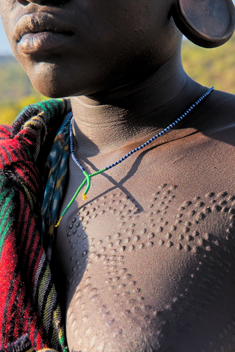 Kichoa : scarifications en tiretés sur une jeune femme Suri en Ethiopie.